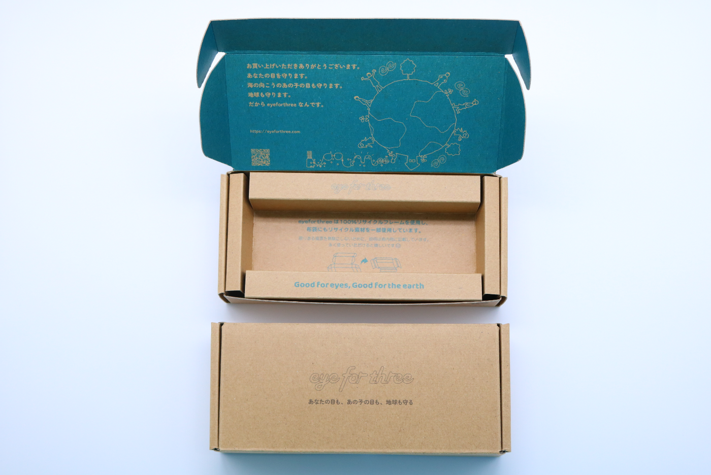eyeforthreeのアイウェアフレームは目薬ボトルの廃プラスチックを100%リサイクルしています。目薬ボトルは、有効成分を紫外線から守るためにUVカット機能がある特別なプラスチック。その特性を活かして、あなたの目を守る目薬ボトルが、あなたの目を守るアイウェアに生まれ変わりました。